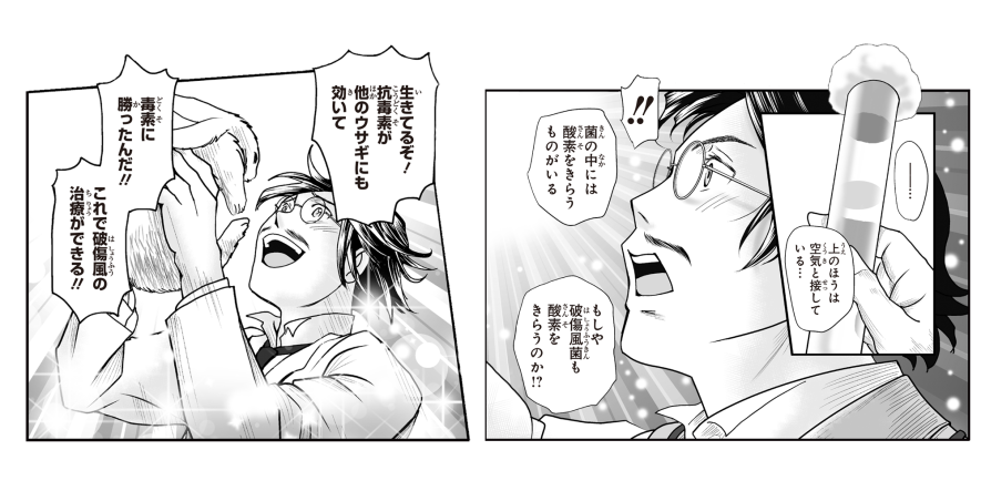 1886年からの6年間、柴三郎はドイツに留学。病原微生物学研究の第一人者であるコッホの下で研究に励み、当時不可能とされていた破傷風菌だけを取り出して培養する純粋培養に成功。さらに、菌の毒素に対する免疫体(抗毒素)を発見し、血清療法という治療法を確立しました。