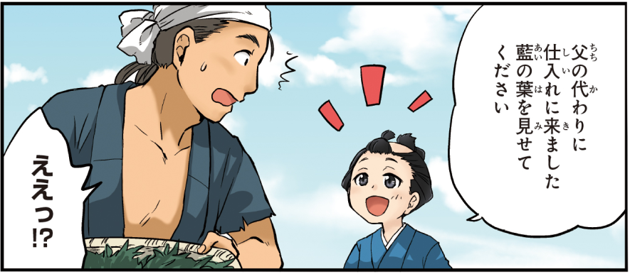 渋沢栄一は、1840年に武蔵国榛沢郡血洗島村(今の埼玉県深谷市)の「藍」を扱う家に生まれました。藍を仕入れに行く父に同行しているうちに藍の葉の目利きができるようになった栄一は、子どもながらに質の良い藍の葉だけを選んで仕入れる、という商いの才能にすぐれていたのです。