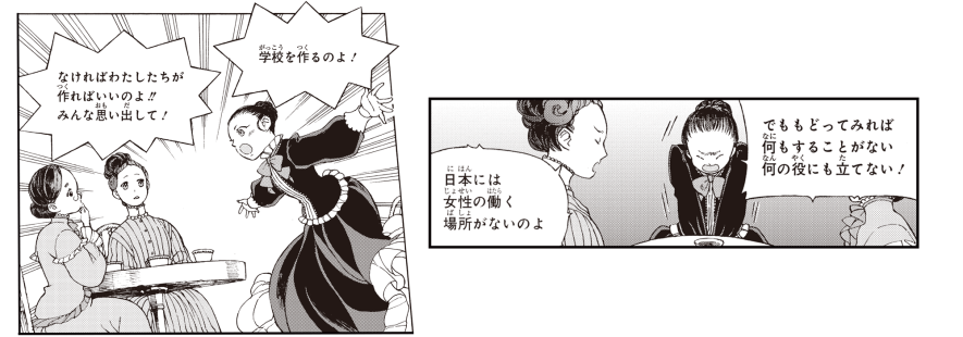 アメリカで語学や文化を学び11年後に帰国した梅子は、アメリカの女性と日本の女性の地位の差や、良妻賢母の育成を主とする日本の女子教育にショックを受け、女性が学ぶことができる学校をつくろうと決意します。華族女学校で教鞭を執った後、1889年、すぐれた教育方法を学ぶために再びアメリカに留学。