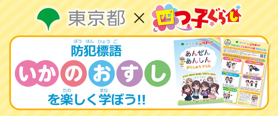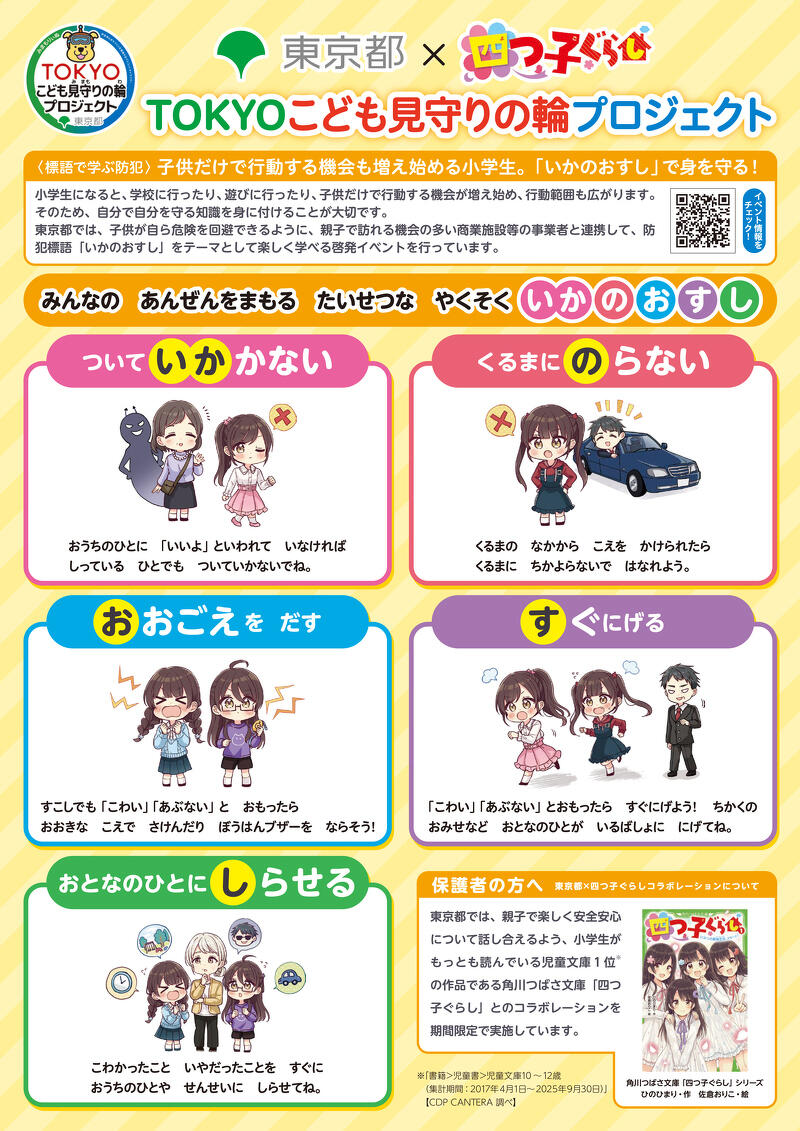 東京都全域の新小学1年生を対象に学校経由で配布される防犯標語「いかのおすし」啓発チラシと、東京都が開催する児童向けの防犯イベントにおいて配布される学習ドリルに、「四つ子ぐらし」が起用されることとなりました。