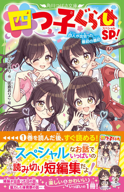 角川つばさ文庫より刊行中の小説「四つ子ぐらし」シリーズは、現在本編が23冊、カラーページを多数収録した『ファンブック』、最新巻まで読んでいなくても楽しめる短編集『四つ子ぐらしSP!』1冊を刊行中の、大人気児童小説シリーズ。