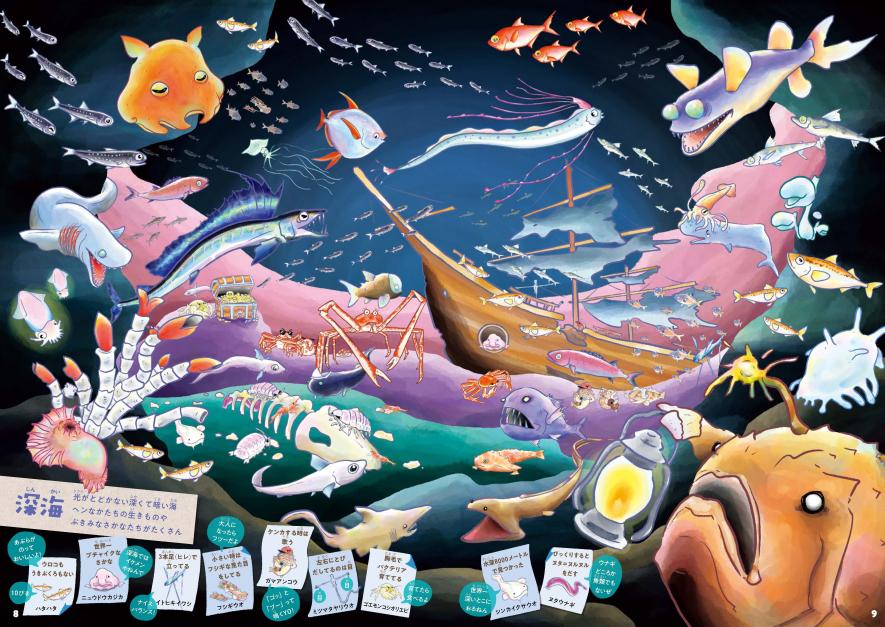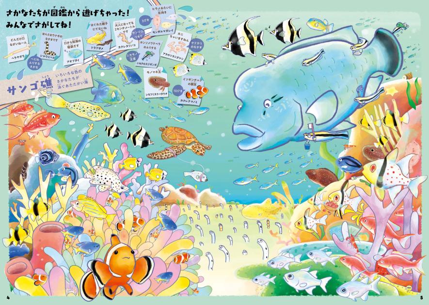 さまざまな場所に逃げてしまったおさかなたちを探して見つけて遊ぶおさかな探し絵図鑑。カラフルで楽しいヴィジュアルと、ちょっとオモロい!?おさかなや水の生きものたちの姿に思わず笑ってしまうかも!?