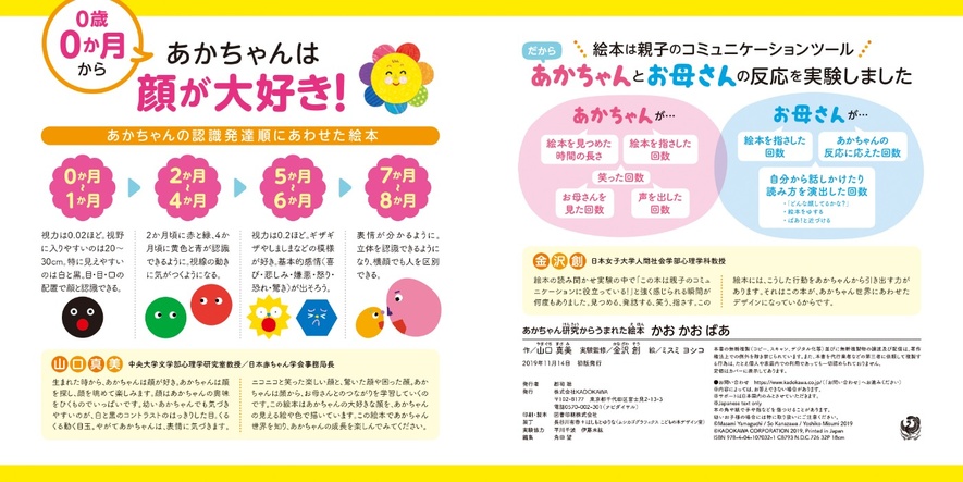 『かお かお ばあ』の作り手は、共に心理学分野の研究に携わられている大学教授であり、ご夫婦でいらっしゃる山口真美さん(中央大学文学部心理学研究室教授)と、金沢創さん(日本女子大学人間社会学部心理学科教授)。つまり、第一線の研究職の方によって作られた絵本なのである。