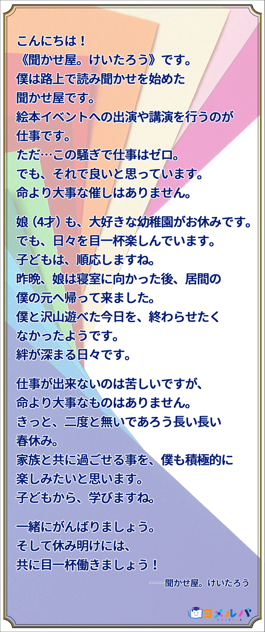 おうちで過ごす子どもたちに元気を!聞かせ屋。けいたろうさんからのメッセージ 2020年04月27日 保護者 保育士・幼稚園教諭 この記事をブックマークする 『まいごのたまご』翻訳者で、読み聞かせイベントなどを行っている「聞かせ屋。けいたろう」さんからメッセージをいただきました! みんなで一丸となって新型コロナウイルス感染拡大を防ぎ、この危機を乗り越えましょう! コミックウォーカーでも、作品を掲載中の漫画家さんより、新型コロナウィルス対策で自粛生活を送るユーザーの皆さんへのメッセージとして、寄稿作品が届いています! ぜひご覧ください! くわしくはバナーをクリック! この記事をブックマークする この記事をシェアする