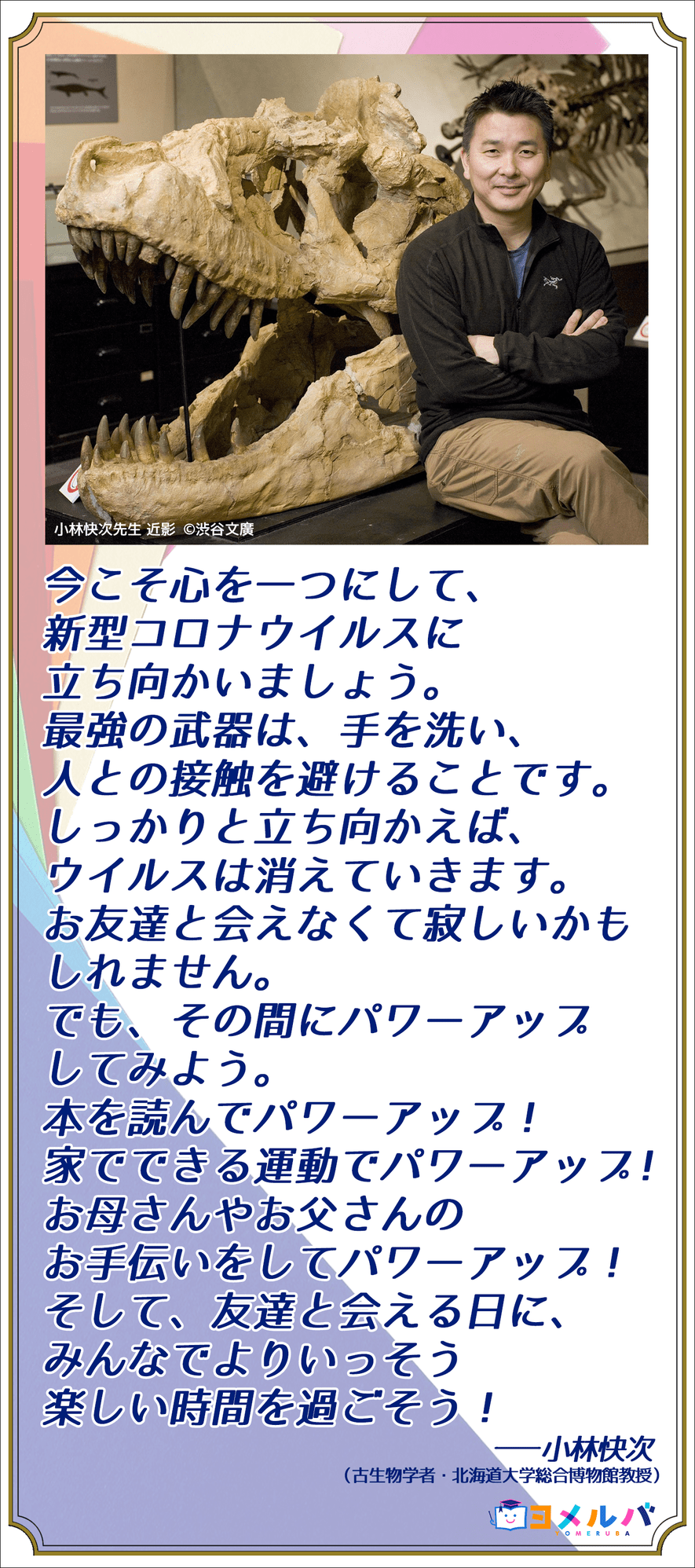 おうちで過ごす子どもたちに元気を!古生物学者・小林快次先生からのメッセージ 2020年04月27日 角川の集める図鑑GET! この記事をブックマークする まんが学習シリーズ「恐竜キングダム」「どっちが強い!?」の監修を手掛ける古生物学者・小林快次先生から、おうちですごすみんなへメッセージが届きました! みんなで一丸となって新型コロナウイルス感染拡大を防ぎ、この危機を乗り越えましょう! コミックウォーカーでも、作品を掲載中の漫画家さんより、新型コロナウィルス対策で自粛生活を送るユーザーの皆さんへのメッセージとして、寄稿作品が届いています! ぜひご覧ください! くわしくはバナーをクリック! この記事をブックマークする この記事をシェアする