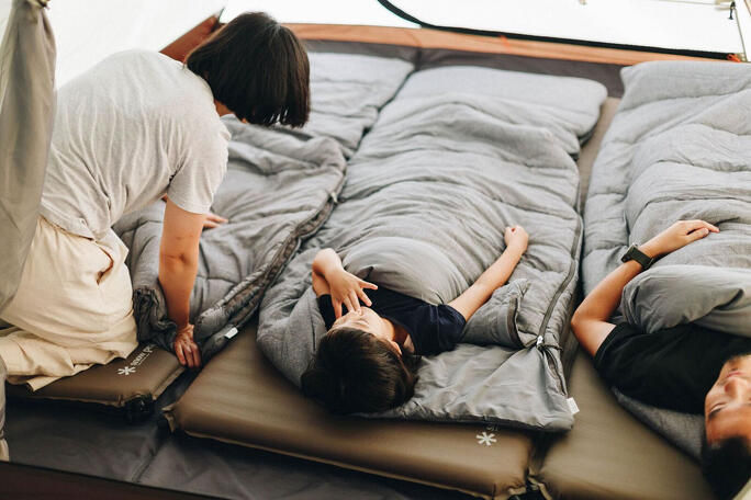 ファスナーを開いて使えば2人サイズのかけ布団に、複数をつなげて使えば親子で添い寝できる寝袋に。