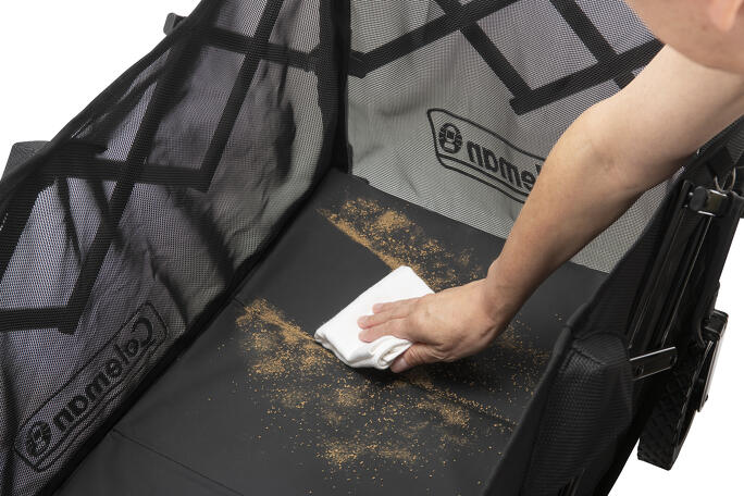 こいしさん:アウトドアワゴンのパイオニアといえば『コールマン』。キャンプ用に開発されたアウトドアワゴンは、王道として多くのキャンパーから愛されています。『アウトドアワゴンNXメッシュ』のいちばんのおすすめポイントは、ボディにメッシュ素材を採用しているところ。細かい土や砂がメッシュのすき間から落ちるため、汚れが溜まりにくくなります。水を弾く底面のボードは水ぶきができ、お手入れも手軽です。
