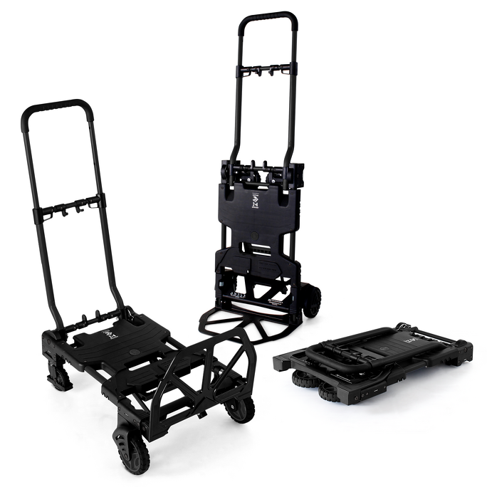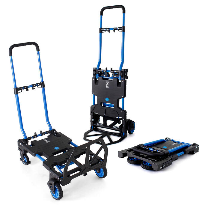 2輪と4輪の2WAYタイプ。タイヤを折りたたむと薄さ13センチに。カラーは、ブルー、ブラックの2色展開。耐荷重は二輪台車時70キロ、四輪台車時120キロ。
