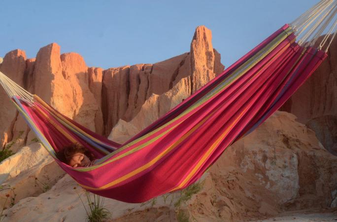 キャンプ場では、ぜひテント横に設営してみてください。ハイキング後に休憩したり、お昼寝したり、椅子のように腰かけてのんびり飲み物を楽しんだりと、さまざまな場面で活用できます。双眼鏡を使って、ハンモックに横になったまま野鳥観察や星空観察をするのもいいですね。子どもが小さいときは親子でハンモックのひとときを満喫して、子どもが大きくなったら親専用にすることもできます。最近は、テントを持参せずハンモックで就寝する「ハンモック泊」と呼ばれるキャンプスタイルも確立されています。丈夫な生地のものを選べば、想像以上に長く使えますよ!