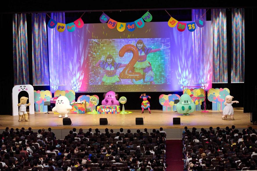 ホール内に入ると、会場は超満員! 赤ちゃんたちはもちろん、大人たちもシナぷりちゃんのパーティーに参加できる喜びに瞳をキラキラと輝かせています。10分置きに、「ひーたんみーたん」による会場アナウンスがあったりと、開場前のワクワクを盛り上げる演出の中、照明が明るい状態のステージに「ぷしゅぷしゅ」と「ぱるてぃ」、そして「シナぷりちゃん」が登場! 会場の赤ちゃんとパパママたちから大きな歓声が沸き上がります。オープニング「おどってぱるてぃタイム」では、「ぱるてぃ」が華麗なDJプレイを披露し、パーティー気分を盛り上げます。2曲目の「はじまりぷしゅ」では、スクリーンには番組おなじみのOP映像が流れ、席で一緒に踊る小さなお友達の姿も見ることができました。