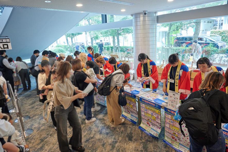 グッズ売り場近くには、大きなフォトスポットが用意されていて、パパママたちのスマートフォンで、この日の思い出をパチリ。また、階段の踊り場などにもキャラクターのパネルがあり、順番を待っているお客さんたちがお互いに撮影係を担当したりと、ピースフルな空間ができあがっていました。