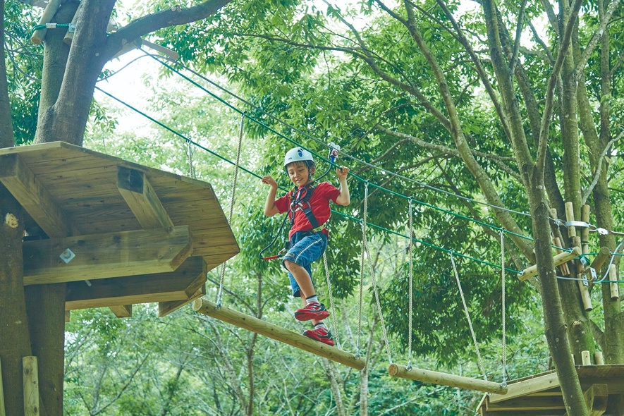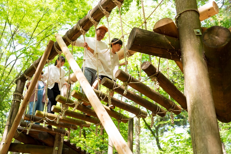 自然の地形を生かした、50種類のポイントが続くコースがあります。子どもたちに人気のアスレチックは、大きな穴の下から走り回って脱出する「ありじごく」。ロープで登って頂上の鐘を鳴らす「マッスルベル」や、指の力で進んでいく「指猿(ゆびざる)」 といった難関ポイントにも果敢に挑みましょう。また、迷路アスレチックや急角度のすべり台フリーフォール、小さな子ども用の複合アスレチックのある「アドベンチャー キッズの森」が、2024年にリニューアルオープン。