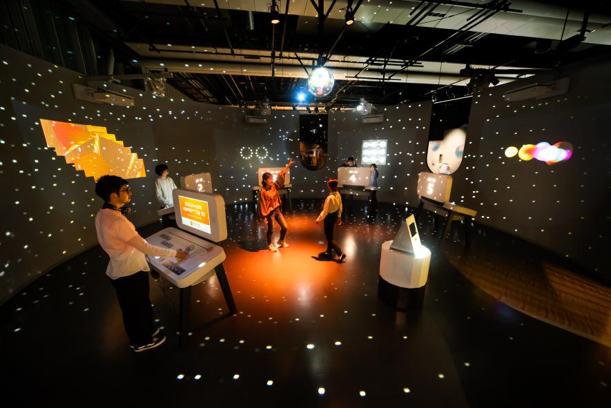 展示室は2~5階の4フロアに広がり、約20種のテーマコンテンツを用意。「でっかいシャボン玉」では、なんと大きなしゃぼん玉に体がすっぽり入る体験ができます! 「ジャンボ・ピアノ」は、特大の鍵盤を踏むと音が出るとともに、それに応じた色や形、大きさの異なる波が現れ、キッズたちは体を使ってエンジョイ。車好きな子に人気なのが、ドライビングシミュレーターを体験しながら、エコについて学べる「タウンドライビング」です。