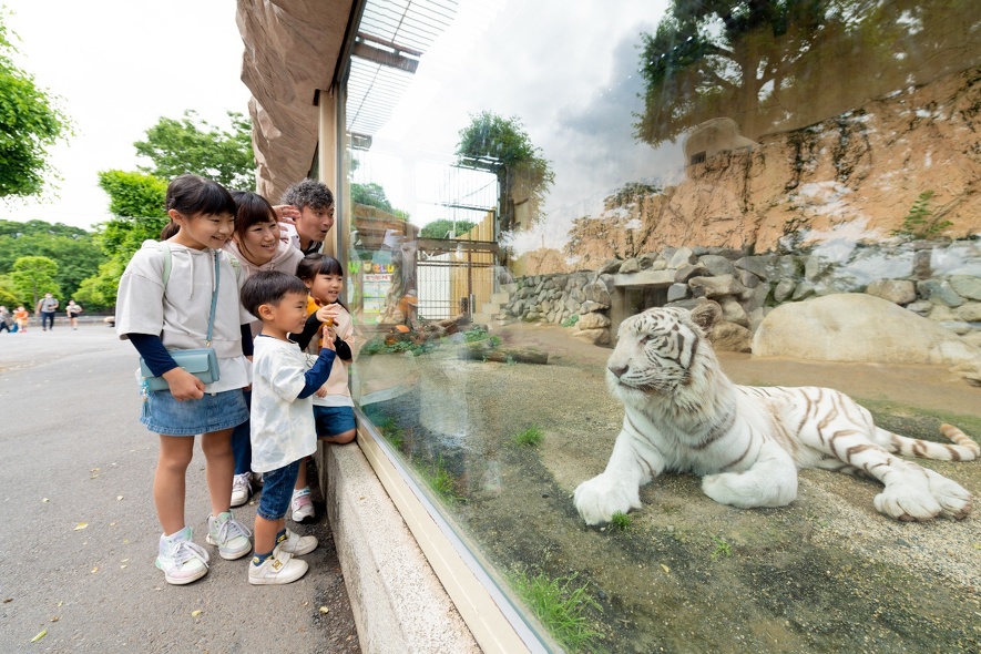 一番人気は、白い毛並みが美しいホワイトタイガーです。土曜・日曜には「ホワイトタイガーガイド」があり、飼育係によるエサやりの様子も見られます。「ふれあいどうぶつの森」では、アルパカやワオキツネザルなど約20種の動物に大接近! なかでもウサギやモルモットとのふれあい体験を楽しめる「ふれあいハウス」(要整理券)は、小さな子どもの動物園デビューにもぴったりです。ヤギやヒツジのエサやり体験(有料)や、1歳から挑戦できる「ポニーの乗馬体験」(有料)もおすすめ。