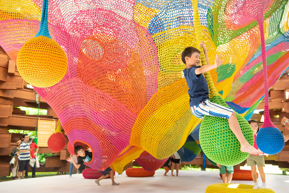 キッズたちに大人気なのは「ネットの森」です。木造ドームの中にある、カラフルな手編みのネットがいくつもつなぎ合わされた巨大なハンモックの作品に、足を踏み入れて遊びましょう!(ネットの中に入れるのは小学生以下)。