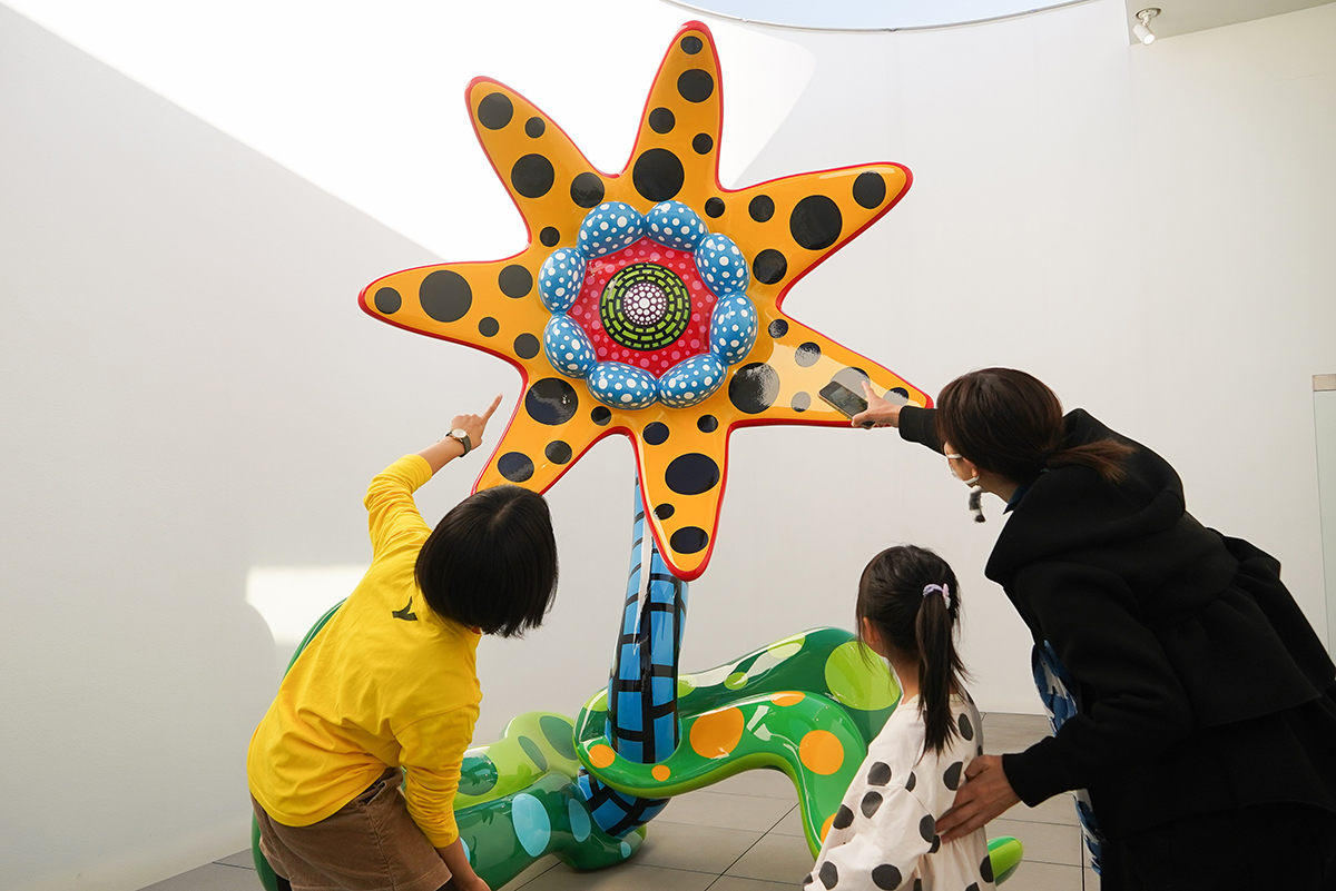さまざまな教育普及プログラムにも力を入れています。その一つが、親子で作品についてお話しながら草間作品の鑑賞を楽しむプログラム、「おやこで美術館」です(対象は未就学児とその家族)。美術館初体験というファミリーでも、スタッフがいろいろと質問したり、お話をしながら鑑賞のサポートをしてくれます。不定期開催なので、公式HPをチェックして事前に申し込みを。