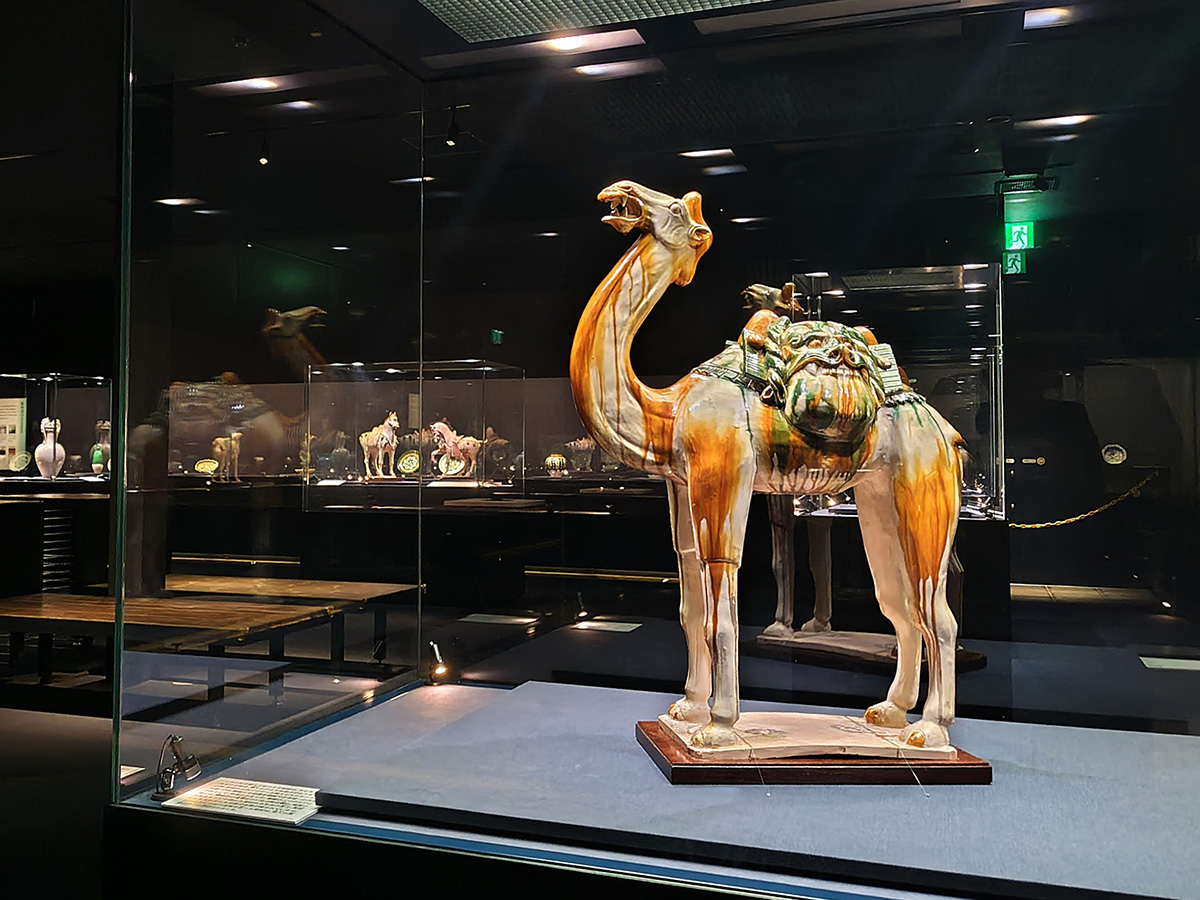 展示作品で目を引くのは、縦12m・横30mの巨大な風神・雷神の大壁画「風・刻(かぜ・とき)」です。さらに、その大壁画を楽しみながら利用できる、100%源泉かけ流しの「足湯カフェ」が併設されています。展示室のタッチパネルと作品解説には、英語や中国語、韓国語のほかに「こども語」を用意。わかりやすく楽しんでもらえるように作成された解説文は、ユーモアたっぷりです! また館内には、動物をモチーフにした焼き物や絵画がたくさん展示されています。ラクダ、馬、龍など、実在する動物や空想上の生き物を、親子で探しながら鑑賞してみてはいかが?