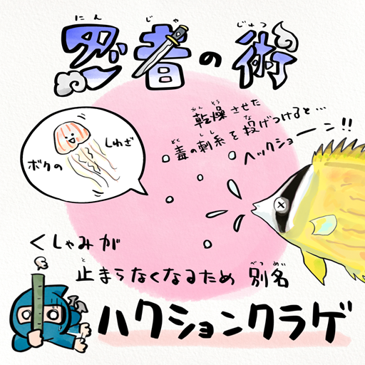 まず、この触手を粉にして持ち歩き、敵に追いかけられたらエイっと投げます。粉になった触手が、敵の鼻や目に入って、くしゃみ・涙が止まらなくなっている間に逃げるという、目眩ましの術に使っていたのだとか。アカクラゲは、「ハクションクラゲ」と呼ばれていることをかわちゃんが教えてくれました。