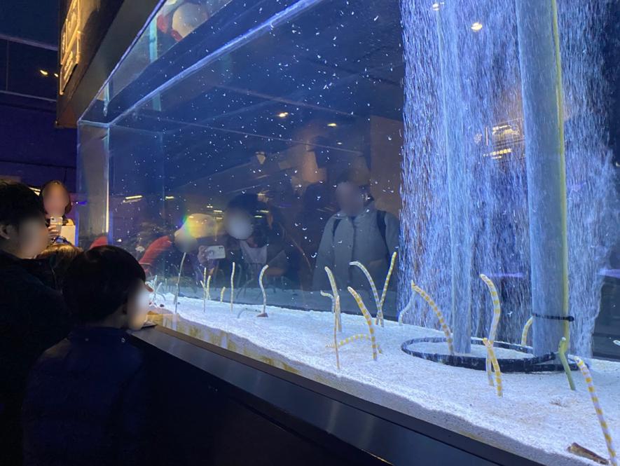 お次はチンアナゴのコーナーへ。水槽前についたときには、頭がほんの少し見える程度だったチンアナゴたちでしたが、飼育スタッフさんがゴハンをあげるとニョキニョキと伸びてきます。