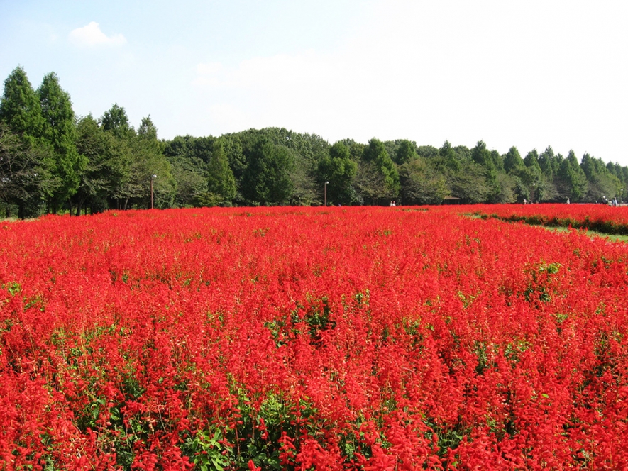 後藤有紀さん:ここでおすすめなのは、サルビアのお花畑。夏から秋の季節には、身近な公園の花壇などでよく見かけるお花ですが、一面のお花畑として植えられているのは珍しく、目が覚めるような鮮やかな赤が苑内に広がる光景は、印象に残ります。見頃は年に2回、7月中旬から8月上旬と9月中旬から10月上旬です。8月の中ごろに一度剪定されるので、サルビアを見にお出かけの際は公式HP等で開花状況を確認してから行かれることをおすすめします。サルビアが見られない時期でも、ヒマワリやアメリカフヨウ、マリーゴールドなど、夏の花々はいろいろと咲いていますよ! 秋には、サルビアとコスモスとの競演も見られるので、お好きな時期に訪れてみてくださいね。
