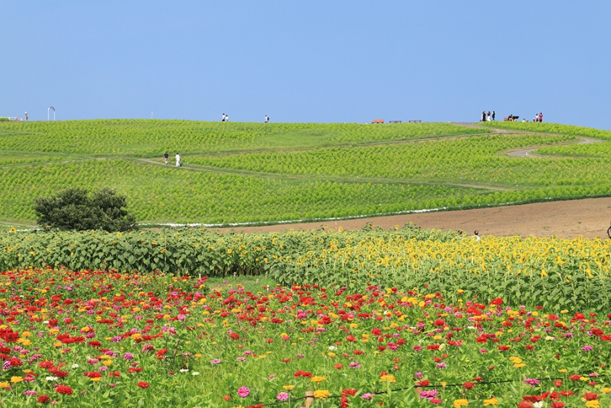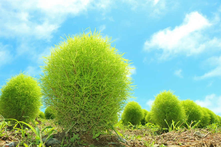 後藤有紀さん:「みはらしの丘」一面が爽やかなネモフィラブルーに染まる春の景色は、世界的にも有名になりましたが、真夏の景色もおすすめです。緑が広がる丘を背景に、ジニアやヒマワリが鮮やかな夏色を添えます。また、8月中旬ころになると、まだ育ち始めのコキアの姿が丘一面で見られます。コキアといえば、真っ赤に染まる秋の時期が一番の見頃ですが、小さく青々としている夏のコキアも、マリモのように可愛らしくて癒やされます。隠れた夏の人気者のコキア、ぜひ一度会いに行ってみてくださいね!