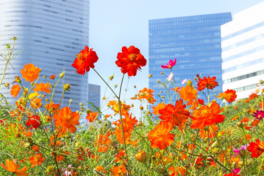 都会のビル群を背景に楽しめる花畑