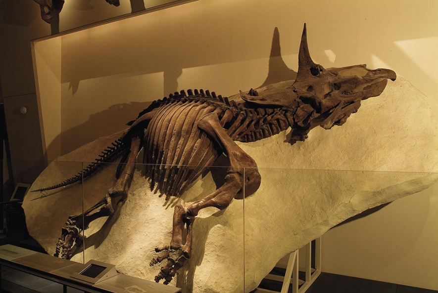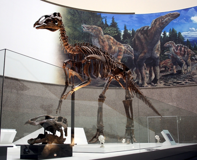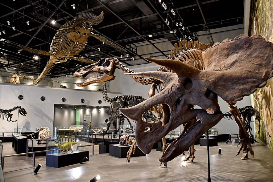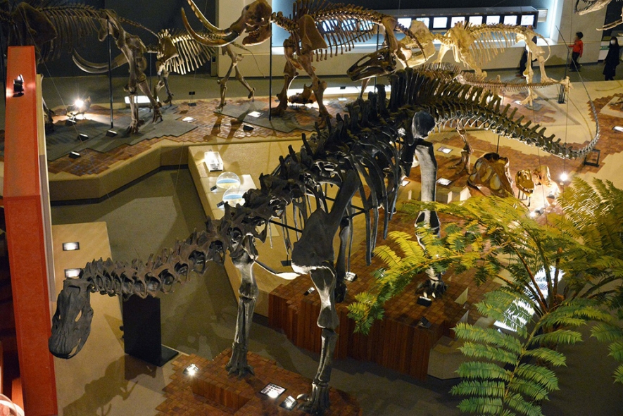 地球の歴史と生命の多様性を紹介する自然系博物館。エントランスホールには、通常は四足歩行の恐竜とされるチンタオサウルス・スピノリヌスの複製が、上空を舞う翼竜や天井画に合わせるため、後ろ足で立ち上がった姿で再現されています。