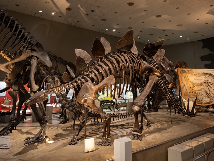 肉食性で鋭い歯と爪を持ったアロサウルスの全身骨格を見たちびっ子は、体長10m・体高4.5mの大きさにびっくりするはず。有名な恐竜・ステゴサウルスは、体長4~9mの体の大きさに対して非常に小さい頭、背中の骨板と尾のトゲが特徴です。自分の目で確認してみて。