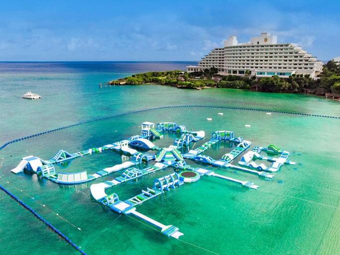 ホテル「ANAインターコンチネンタル万座ビーチリゾート」が運営する、総面積において日本最大級の海上アスレチック。沖縄・万座ブルーの海に、巨大なエア遊具が浮かぶさまは圧巻です。