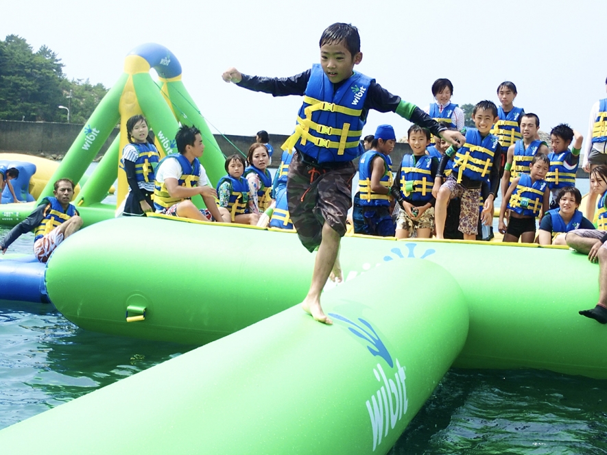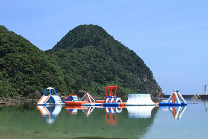 兵庫県の日本海側に面する竹野浜海水浴場は、山陰海岸でも屈指の景勝地です。約1kmも続くキメの細かい白砂のビーチも、「快水浴場百選」と「日本の渚百選」に選定されています。加えて、海水の透明度は関西屈指。そんな風光明媚な場所に、スライダーやトランポリンをはじめ、多彩な遊具が連なる大型アスレチックがお目見え。海上を走って・跳ねて・すべって、目いっぱいエンジョイを! 周辺の浜茶屋やキャンプ場にも立ち寄ってみて。