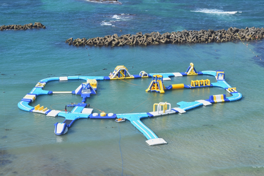 時間制限がなく、一日中遊び尽くせる道内最大級のマリンアスレチック。大小さまざまな遊具の数は50種類前後! 巨大すべり台、シーソー、ウォーターロールに加え、バナナボート(小学生以上利用可)、サップ(有料)などで思う存分楽しめます。コースが2種類あるのも特徴で、比較的簡単なコースと難易度の高いアスリートコースを用意。アスリートコースは潮の満ち引き、波の高さで難易度が日々変わり、沖側にある高さ2mのジャンプ台が大人気です。