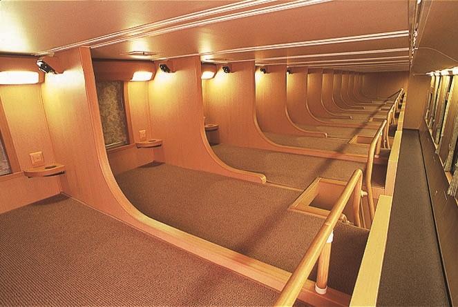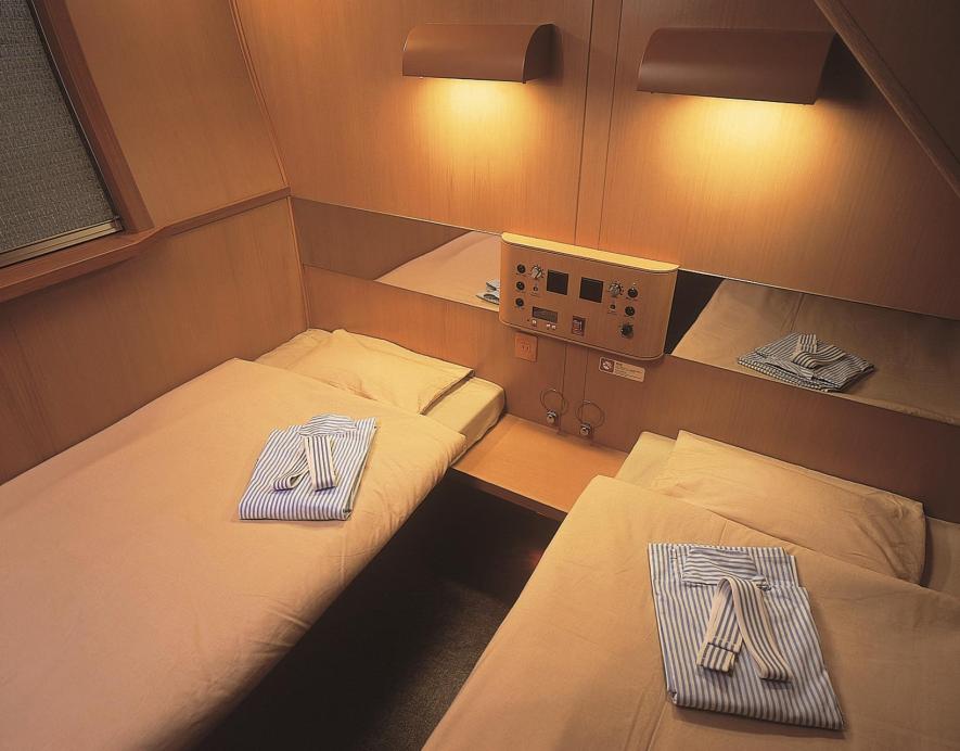 「B寝台個室シングルツイン」は1人用の個室ながら、2人での利用OK。ベッドが上下2段あり、子どもにとっては秘密基地のよう。ベッドを並列に配した2人用の「B寝台個室サンライズツイン」もそろいます。また、1人用にはなりますが、寝台料金なしの「普通車ノビノビ座席」も。カーペット敷きで足を伸ばして過ごせる寝床が好評です。