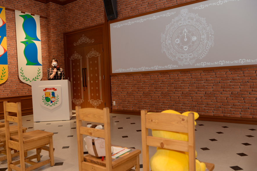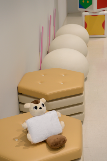 ロッテの人気製品がモチーフになった椅子やフォトスポットがあり、始まる前からテンション上がりまくりです。待っている間、お子さんと一緒に何のお菓子か考えてみてください。