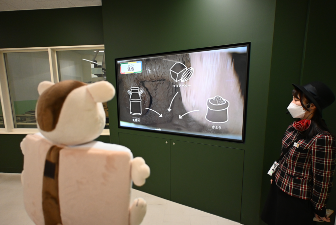 浦和工場では、製造工程が窓越しに見られるだけでなく、デジタル技術をいろいろなところに導入することで見学のサポートをしつつ、理解の向上の助けをしています。 最初から最後までが見られるわけではないので、そこは映像で補填しながら全体をきちんと学べるようになっています。(ロッテ担当者より)