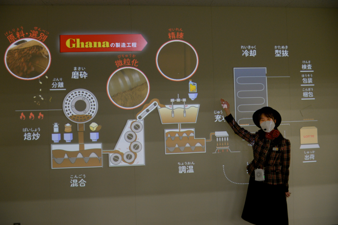 「ガーナチョコレートコース」では、まず映像で製造工程をチェック。その後に、“チョコレートの滝”で詳しく学んでいきます。