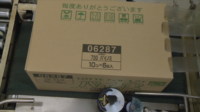 箱詰めされたパイの実がベルトコンベアで運ばれていきます。