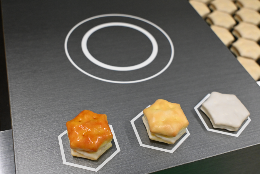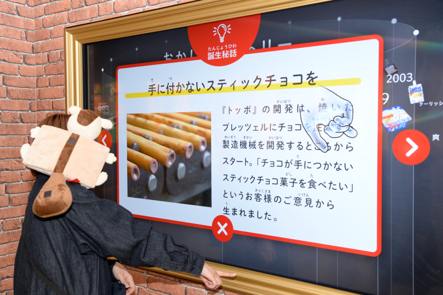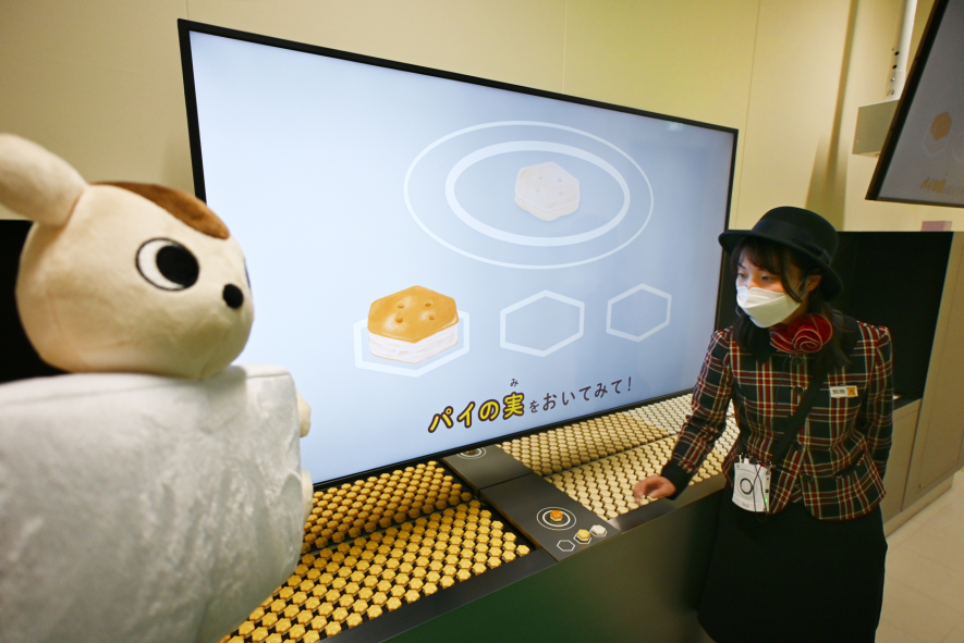 65メートルの焼成の設備をぎゅっと縮めたコンテンツです。焼く前、焼きあがる途中、焼き上がりの3種類の模型を順に中央の丸い箇所に置いていくと違う映像が流れます。おいしさの秘密を体験しながら知ることができますよ。(ロッテ担当者より)