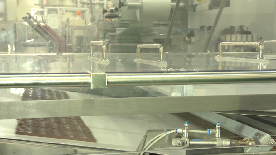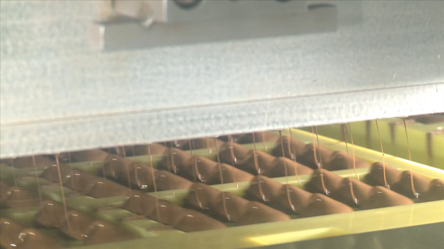 やわらかいチョコレートが流し込まれ、さまざまな工程を経て次々と出来上がっていくチョコレート。