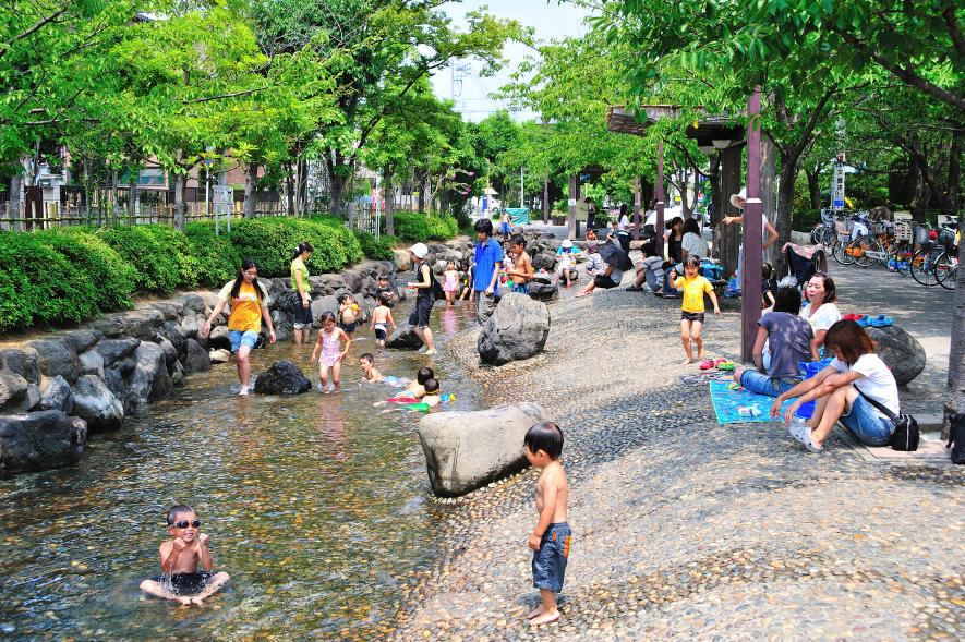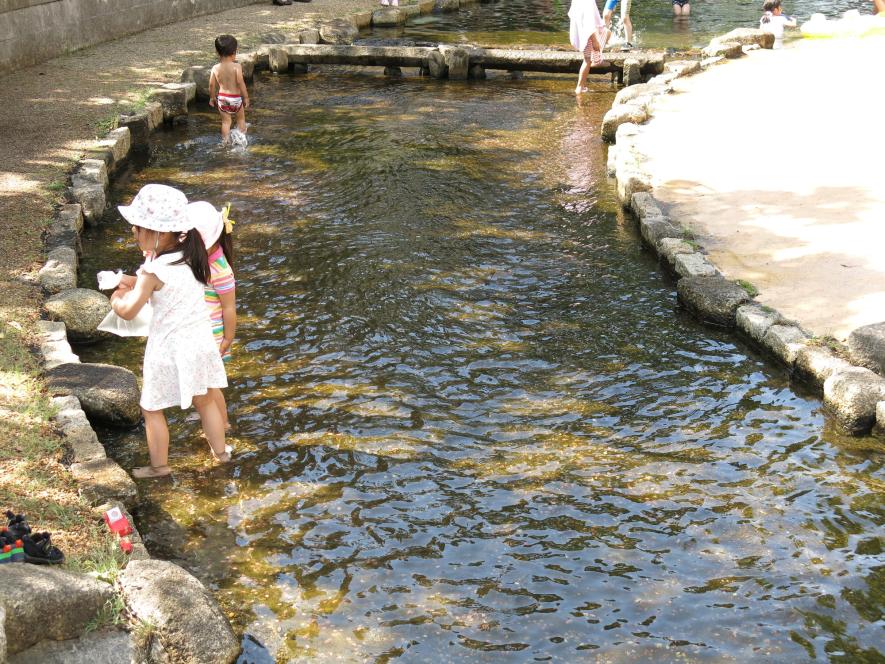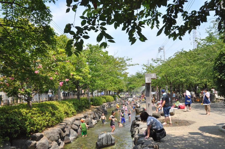 「水の広場」と呼ばれるじゃぶじゃぶ池は、親水公園の上流部・中流部・下流部の3か所に設けられ、夏場は子連れファミリーの憩いの場に。水深はエリアにより多少変わりますが、約10~50㎝と幅があるので、幼児と小学生が同じエリアで遊ぶことができますよ。