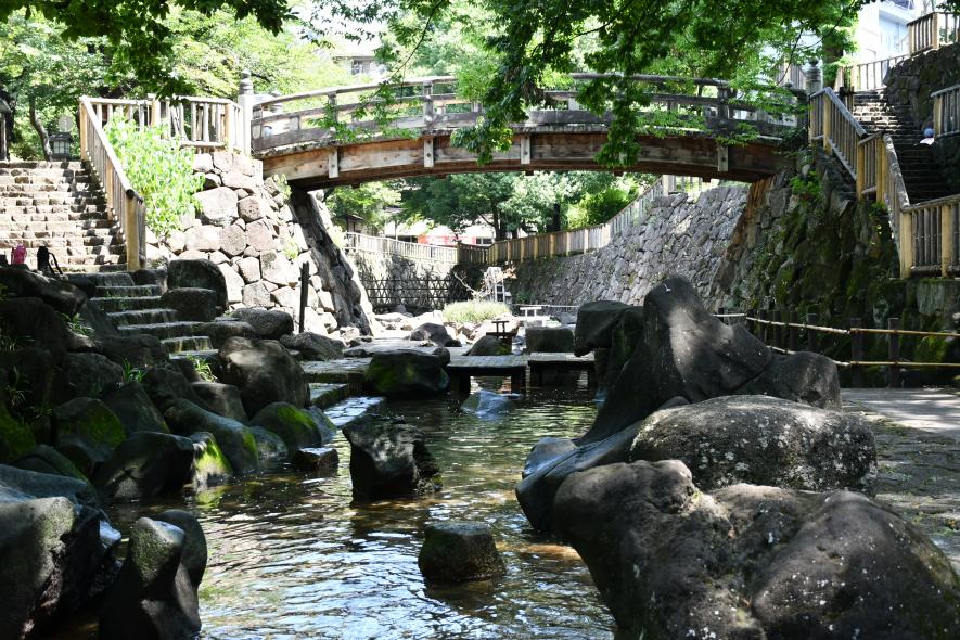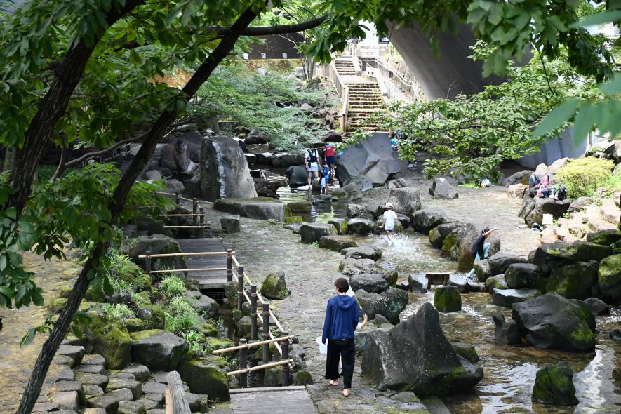 石神井川(しゃくじいがわ)の旧流路に整備された「音無(おとなし)親水公園」。旧流路を利用した約100mの水遊び場は、木々や自然石に囲まれ、まるで自然の小川のような好環境。滝も1か所にあり、子どもたちはワクワクして探検家の気分に!?
