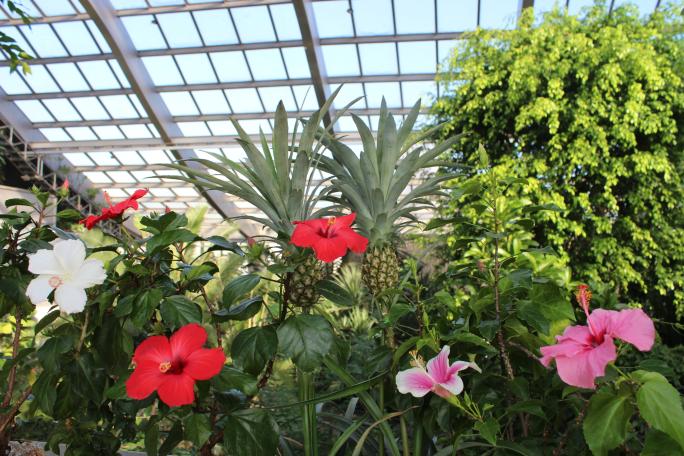 大温室、熱帯果樹温室などを備えた洋風の庭園。公園のシンボルの一つ、大温室の「花の滝」には、夏にネペンテスというツボ型の食虫植物を展示します。ほかにも、さまざまな食虫植物や池に浮かぶスイレン、青い豆の花のチョウマメなどが夏を代表する植物です。