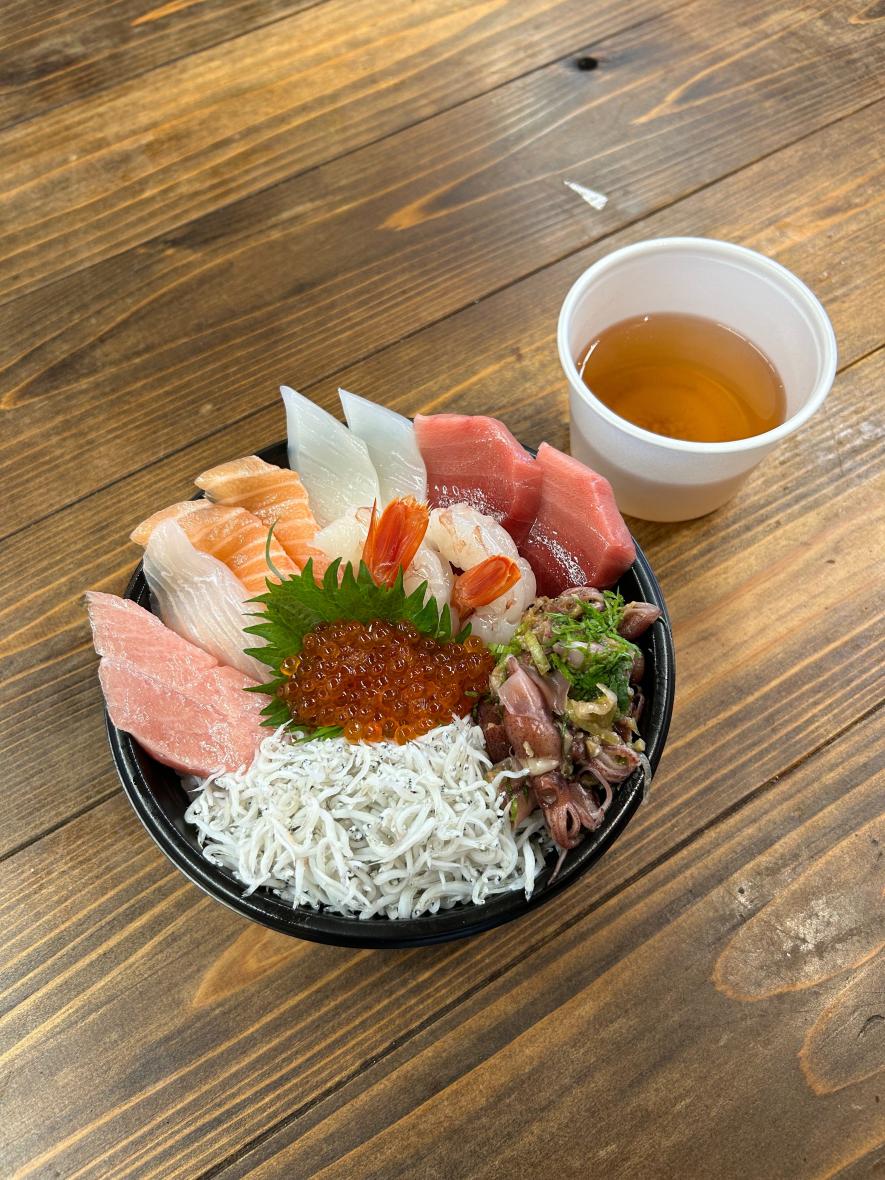 地元・漁港から水揚げされた地魚を扱う海産物販売店が、市場スタイルで営業。その鮮度抜群の魚介を使った料理を楽しめる飲食店が併設されたグルメスポットです。なかでも有名なのが、「あかつ水産」の味勝手丼(みがってどん)と海鮮浜焼き。味勝手丼は、自分が好きなものを好きな分だけ選ぶ自分だけの海鮮丼です。
