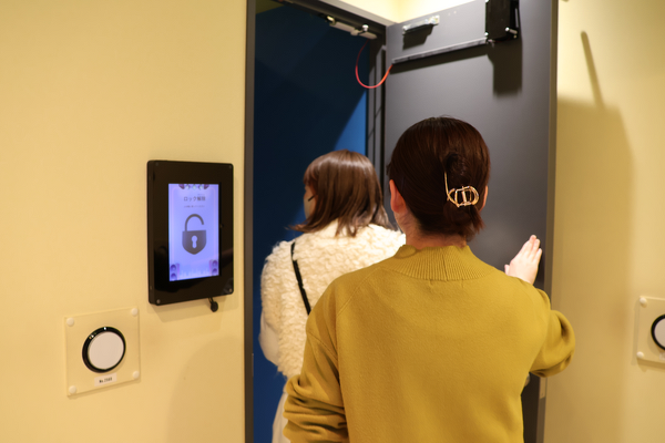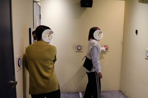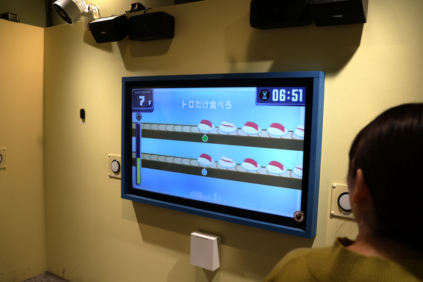 個室には、モニターと8個のボタンが四方の壁に設置されています。