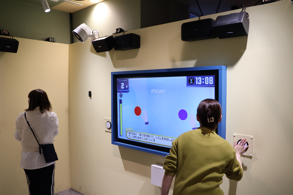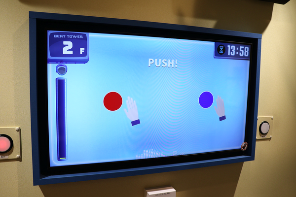 まずは、リズムに合わせてボタンを押したり、ジャンプしたり、動き回ってタワーの頂上を目指す「ビートタワーからの脱出」に挑戦しました。