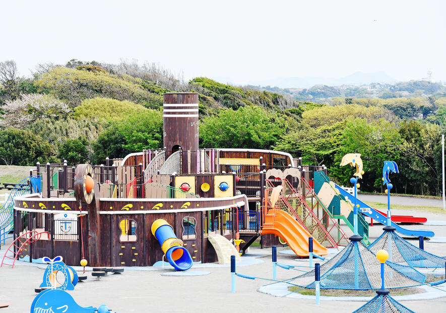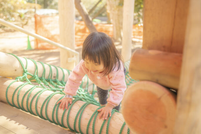 茨城県ひたちなか市の太平洋岸にある「国営ひたち海浜公園」といえば、四季折々の花が有名です。春には約530万本のネモフィラがあたり一面を青色に染めあげ、空と海と丘が溶け合う圧巻のパノラマシーンを楽しめます。そんな「みはらしの丘」から大きな草原を抜けると、15種類のアスレチック遊具が設置された「林間アスレチック広場」が登場。「恐竜の背渡り」「ターザン砦」「へそ曲がりラダー」などユニークな名前がついた遊具は、子どもたちに大人気です。西口エリアにある「たまごの森」にある9つの卵型の遊具や、ふわふわトランポリン「ぴょんぴょんたまご」も、子どもが夢中になること間違いなし。遊具は対象年齢が異なるため、表示をチェックしてから遊びましょう!