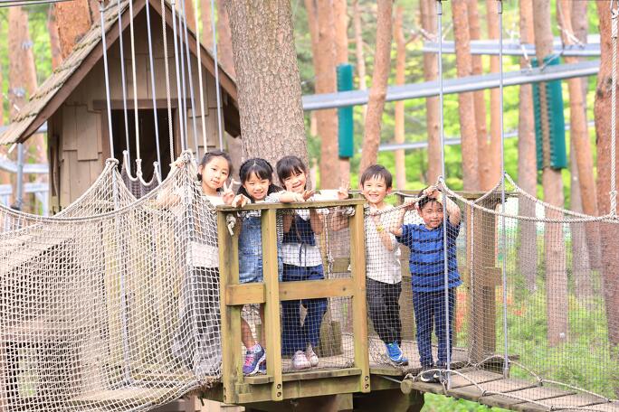 中央自動車道の河口湖ICから車で約10分、富士山の麓に広がるテーマパークです。人気アトラクションのひとつが、富士山の大自然を生かしたアスレチックフィールド「自然体験基地どんぐりコース」。自然素材で作られたさまざまな遊具でスリル満点の冒険が始まります。小学生以上の子どもには、森の中を駆け抜ける空中アトラクション「ロールグライダー」もおすすめ。地上5メートルの高さを回転式の滑車で滑走し、森の中を飛んでいるようなダイナミックな爽快感を味わえます。また、「ジュカの森」では、倒木から薪を作って火を起こしたり、マシュマロを焼いたり、森に秘密基地を作ったりなどの体験に参加できます。無料イベントが不定期で開催されているので、気になる方はホームページでチェック!
