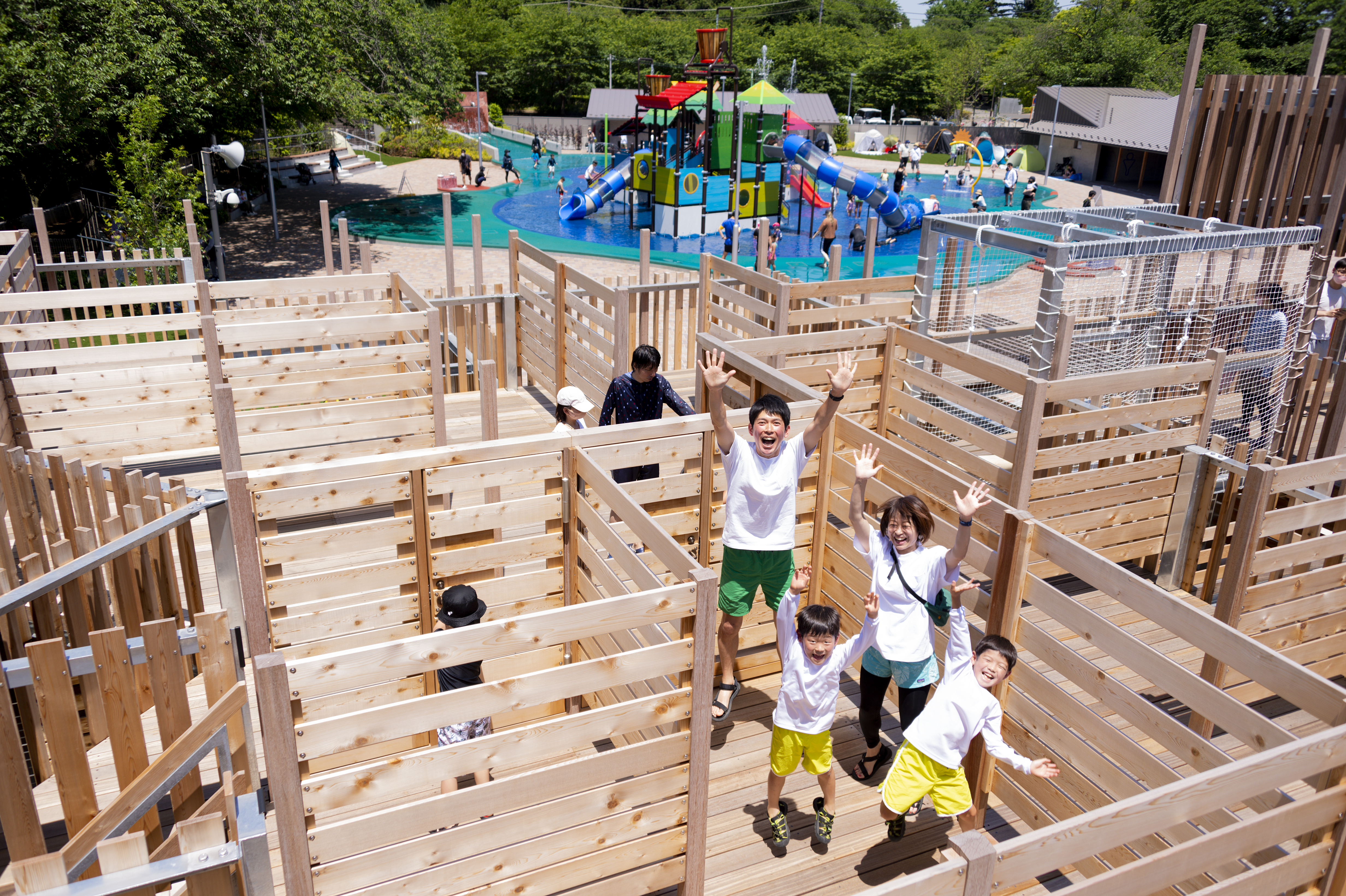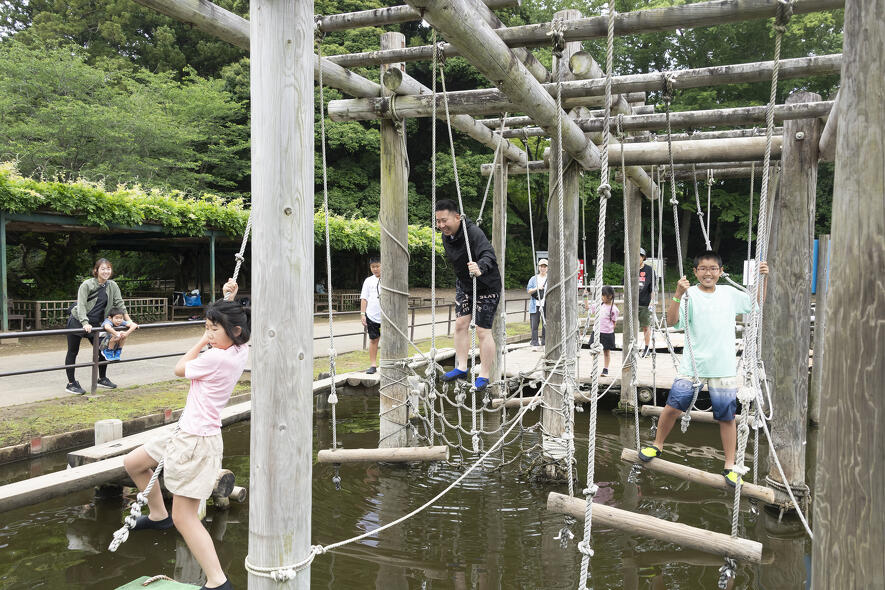 自然とふれあえる数々の施設を備えた「清水公園」の人気スポットといえば、国内最大級の「フィールドアスレチック」。スリルと興奮いっぱいの3つのコースには合計100ヵ所のポイントが。動きやすい服装と靴で全ポイントクリアに挑戦してみましょう! 3歳以上の幼児は、専用のアスレチックエリアで遊べますよ。もうひとつの人気スポットが「アクアベンチャー」です。迷路ゾーンとアクアゾーンの2つのゾーンがあり、6月から9月はアクアゾーンに水が入り、じゃぶじゃぶ池のように水遊びを楽しめます。フィールドアスレチックとアクアベンチャーは混雑緩和のために入場者数を制限しているため、事前に予約してから出発すると安心です。