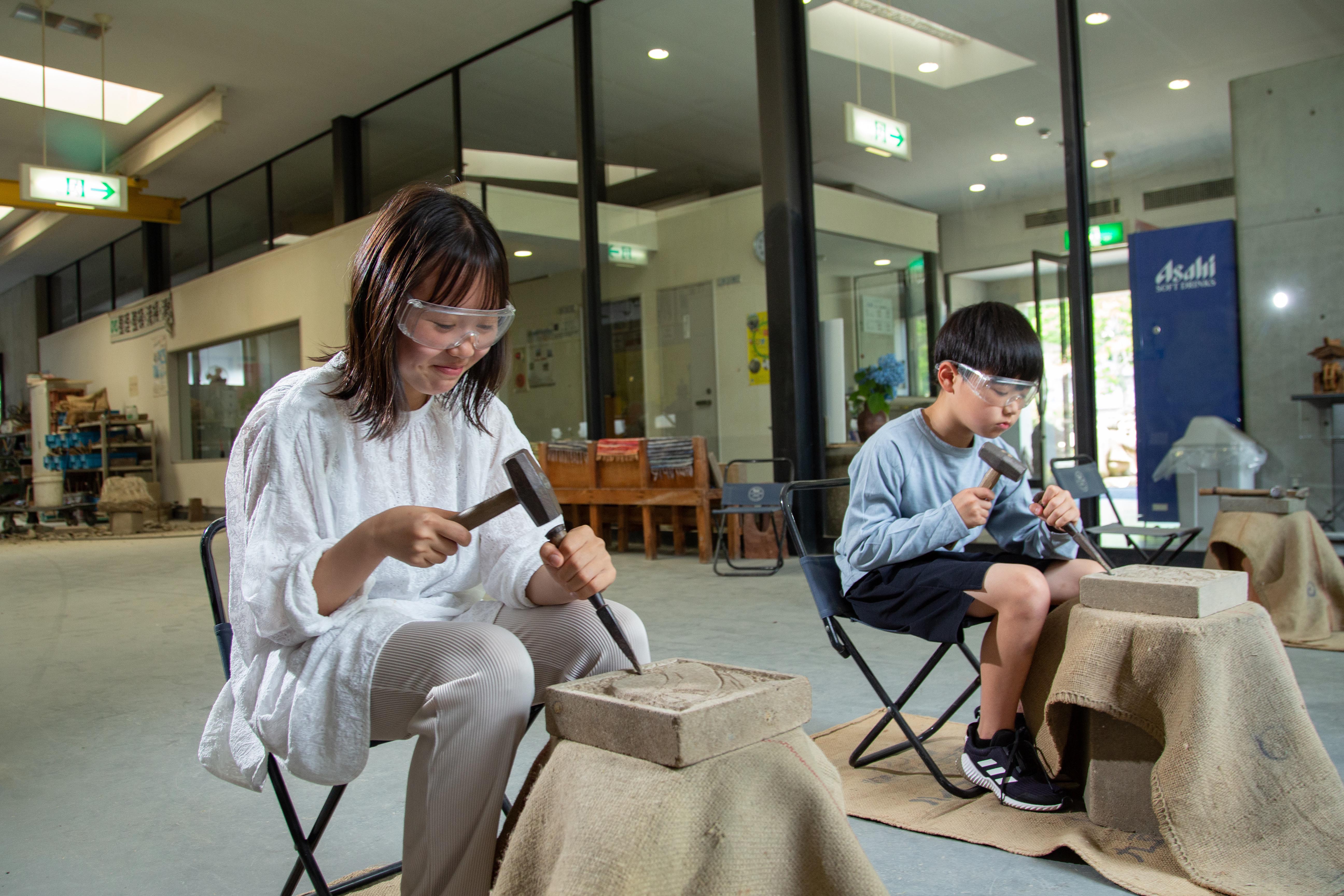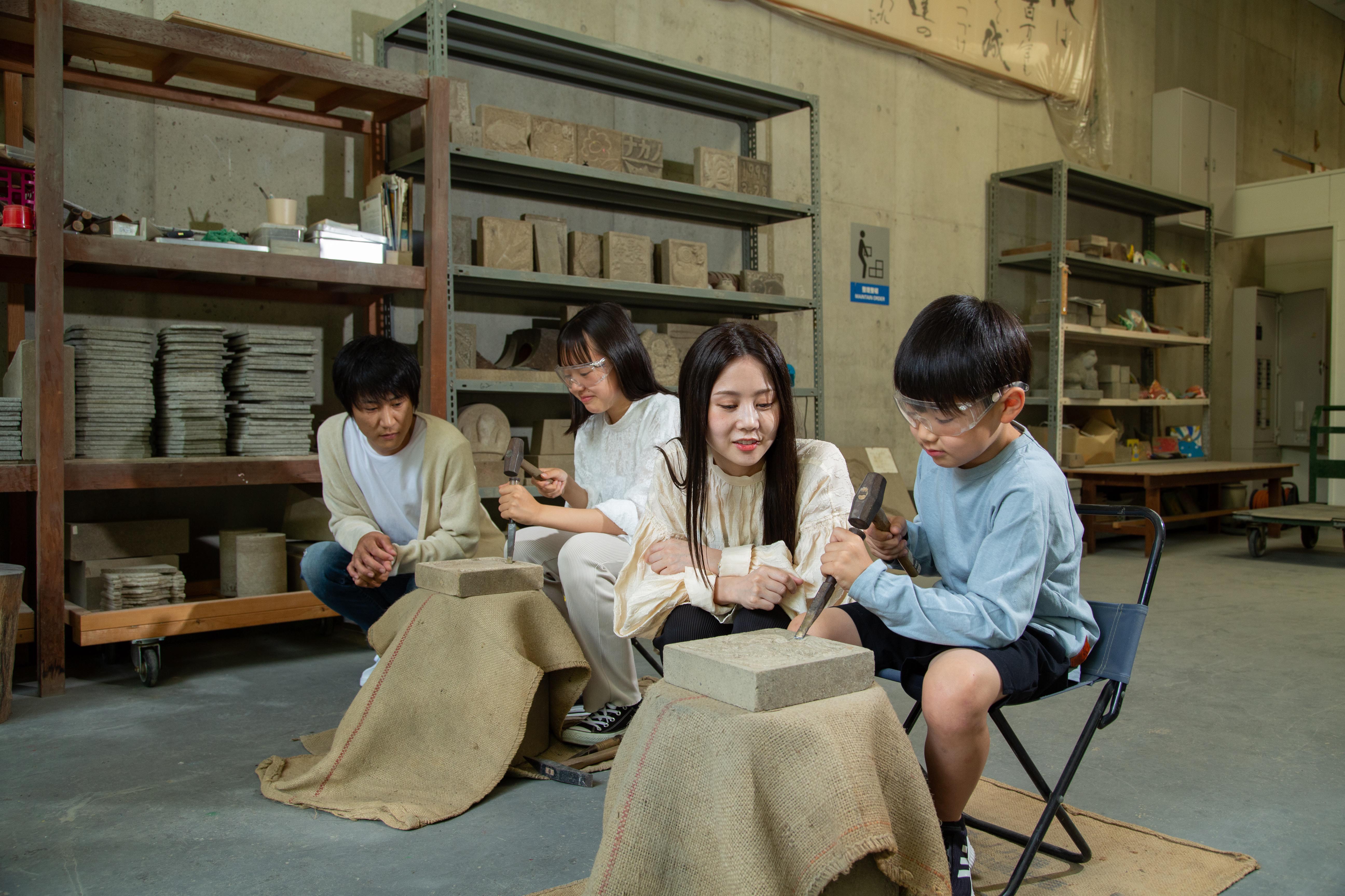 その品質の高さから江戸時代には藩主の許可なく販売・持ち出しが禁止されていたという「出雲石灯ろう」。石工品で初めて国の伝統工芸品に指定された出雲石灯ろうの材料・来待石の彫刻体験に挑戦できるのが、島根県松江市の「モニュメント・ミュージアム来待ストーン」です。「来待石工房」では、職人が使用しているものと同じノミやカナヅチを使い、20センチ四方の来待石の板石に好きな絵や文字を彫刻します。やわらかい来待石は子どもの力でも十分彫ることができるので、お気に入りのキャラクターや柄を彫刻して世界にひとつだけの作品をつくり上げましょう。完成した作品は、当日そのまま持ち帰ってお土産にできますよ。