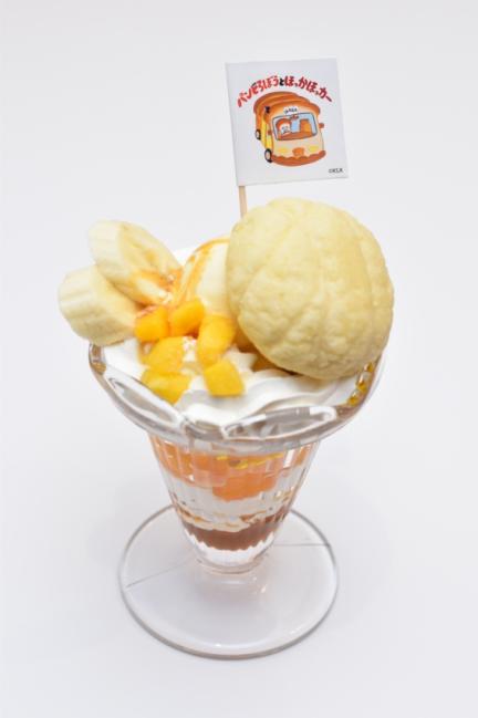 パンどろぼう展 ほっかほっカーのメロンパンパフェ 1,650円(税込)。『パンどろぼうとほっかほっカー』に出てくるメロンパンをイメージしたパフェ。 可愛いフラッグ付き。