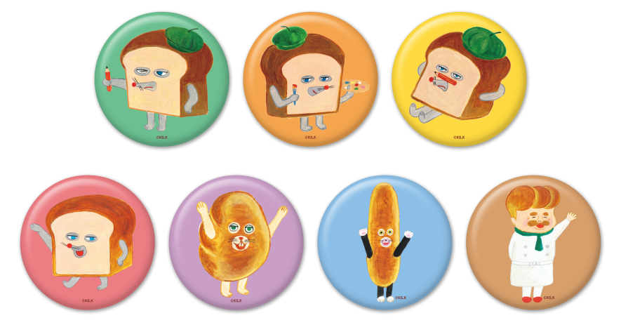 パンどろぼう展 トレーディング缶バッジ 550円(税込)。 描き下ろしイラストを使用した全7種の缶バッジ。